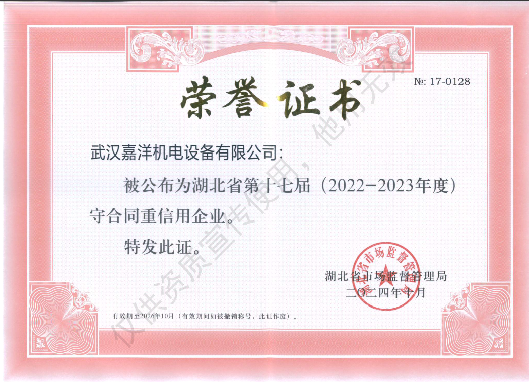 根據(jù)《湖北省合同監(jiān)督條例》《湖北省企業(yè)合同信用狀況公布暫行辦法》相關(guān)規(guī)定,省市場監(jiān)管局組織開展了湖北省第十七屆(2022—2023年度)“守合同重信用”企業(yè)公布活動。按照企業(yè)自愿申報、各地市場監(jiān)管部門審核推薦、省市場監(jiān)管局公開向社會征求意見等程序,省局研究同意,公布湖北省第十七屆(2022—2023年度)“守合同重信用”企業(yè),武漢嘉洋機電設(shè)備有限公司名列其中,喜獲殊榮。